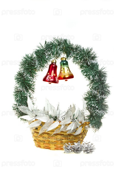 Новогодняя корзинка с колокольчиками на белом фоне