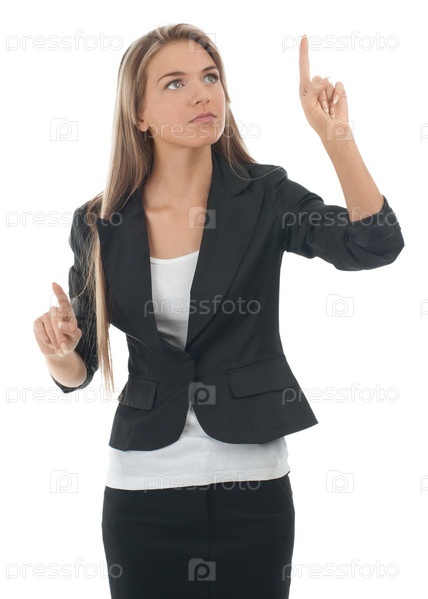 Деловая женщина нажимает сенсорные кнопки экрана, белый фон