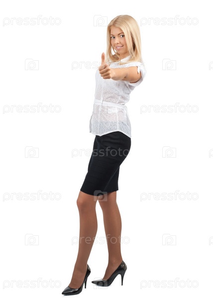 Успешная деловая женщина стоит на белом фоне и показывает большой палец