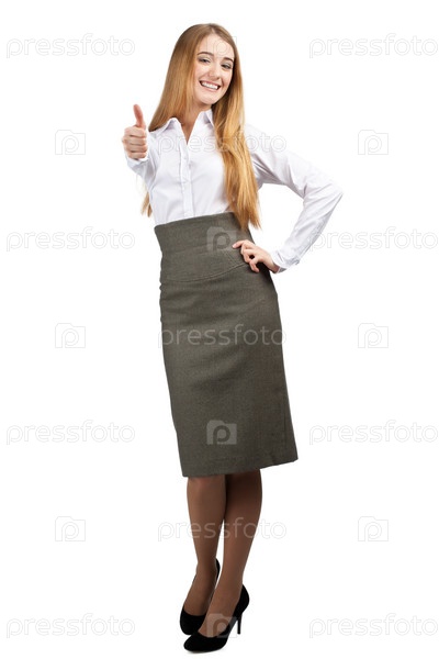 Успешная деловая женщина стоит на белом фоне и показывает большой палец
