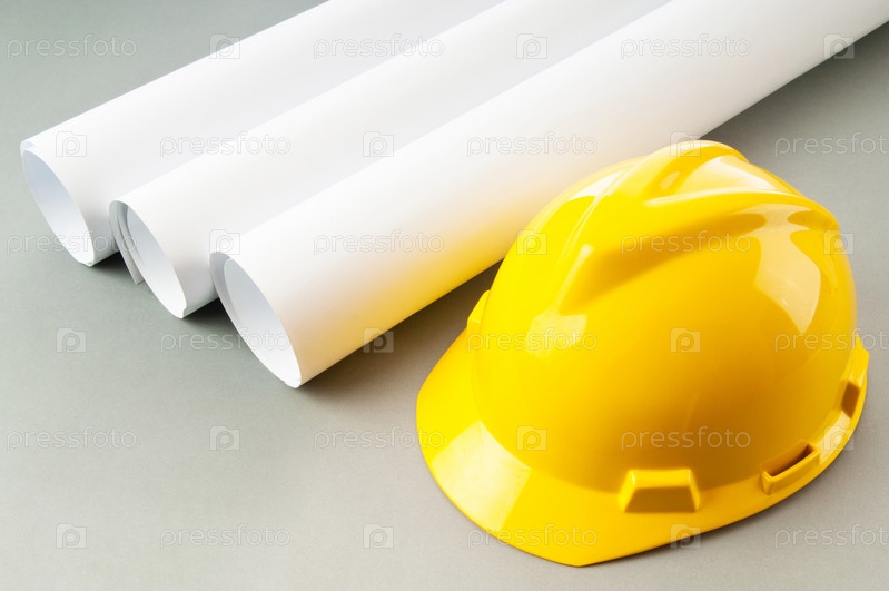 Чертежи и каска на столе