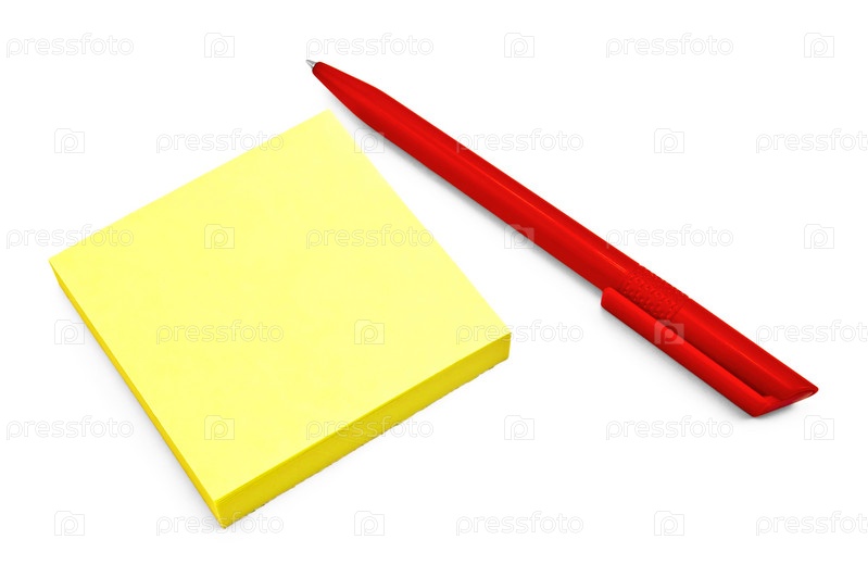 Блок желтой офисной бумаги с красной пластмассовой ручкой, изолировано на белом фоне