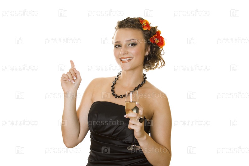 Красивая женщина с орхидеями в волосах держит бокал шампанского, белый фон