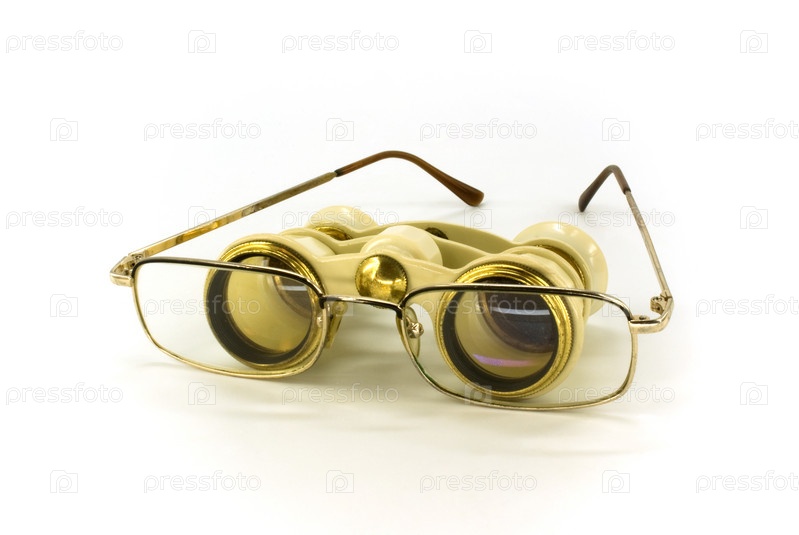 Оперное стекло и очки на белом фоне