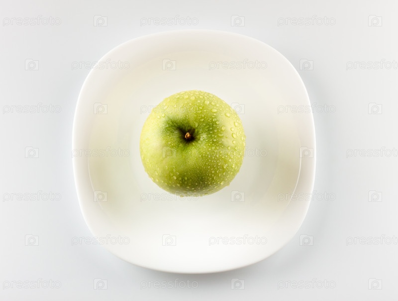 Зеленое яблоко на белом блюде серого фона
