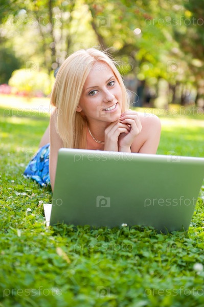 Красивая девушка с ноутбуком лежит на зеленой траве
