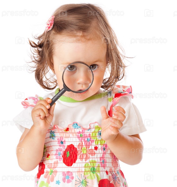 Маленькая девочка смотрит через лупу. Изолирована на белом фоне
