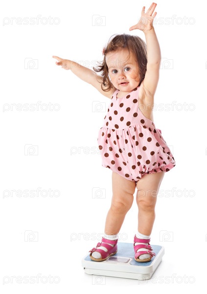 Девочка стоит на весах. Изолирована на белом фоне