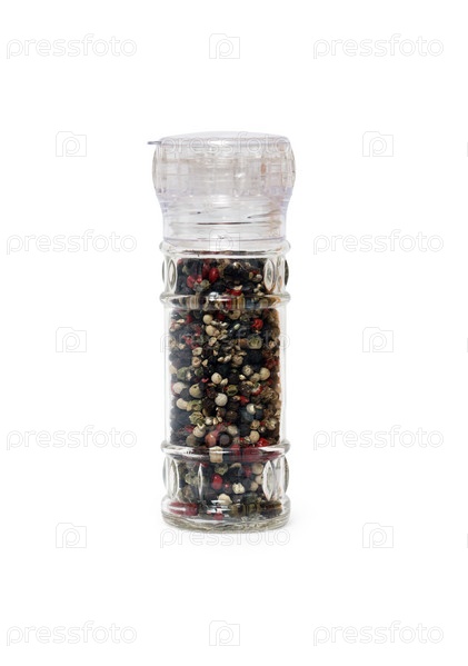 Различные специи в стеклянной мельнице на белом фоне