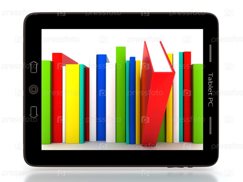 Современные компьютерные технологии - планшетный компьютер с изображением бумажных книг на экране