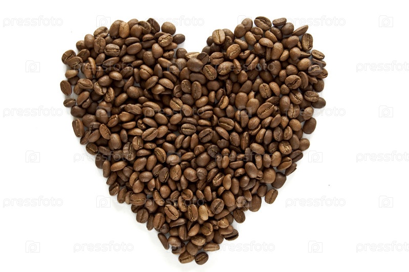 Кофейные зерна в форме сердца на белом фоне