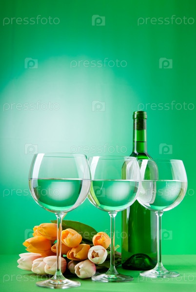 Бутылка вина и наполненные бокалы с букетом тюльпаном на зеленом фоне