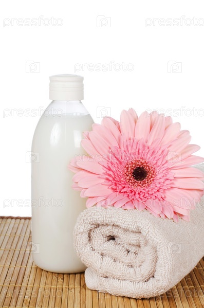 Розовая гербера, бутылка с косметическим средством и полотенце