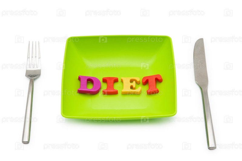 Тарелка со словом 'DIET', вилка и нож на белом фоне