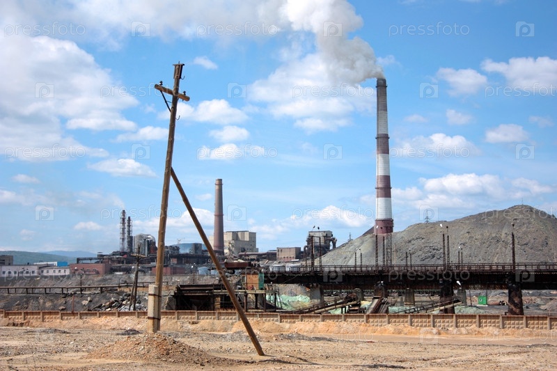 Завод, дымящаяся труба и отвалы отработанной породы
