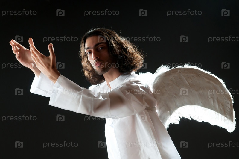 Молодой мужчина в костюме ангела на черном фоне