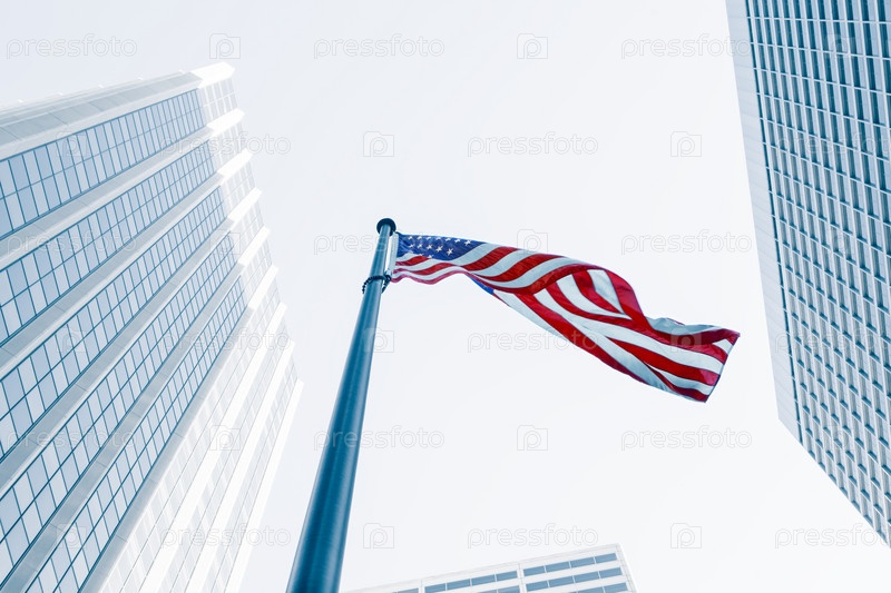 Флаг США на фоне зданий