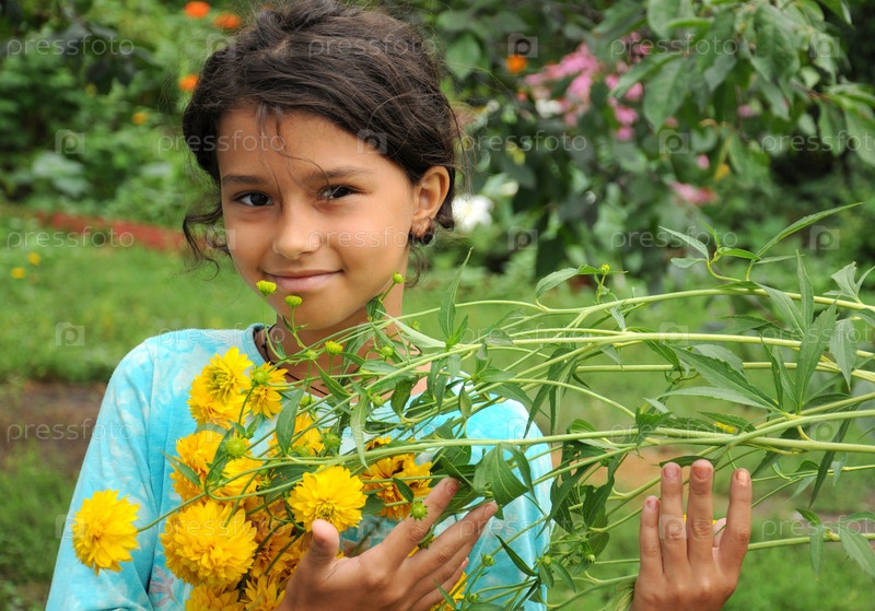 Портрет маленькой девочки с желтыми цветами в летнем парке