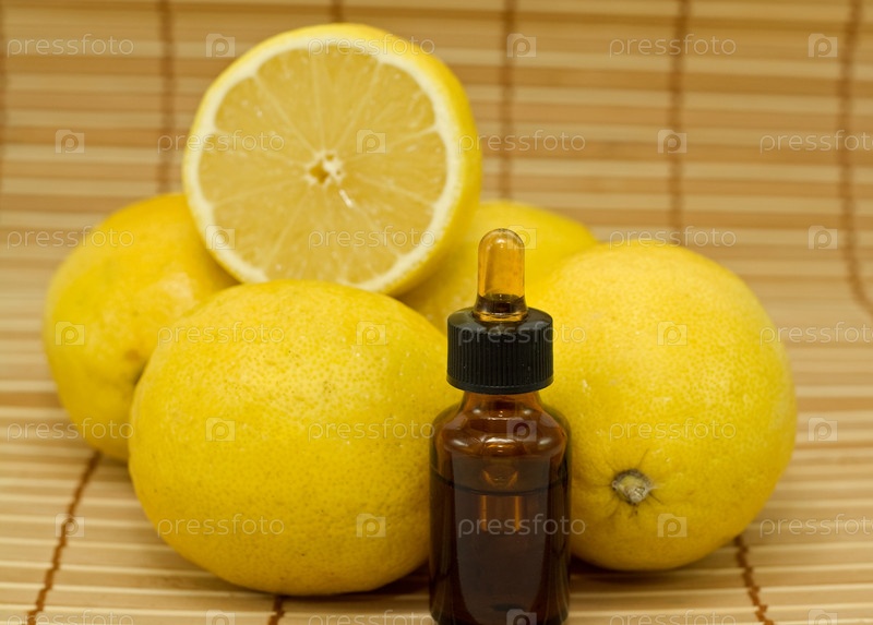 Бутылка с эфирным маслом и спелые лимоны