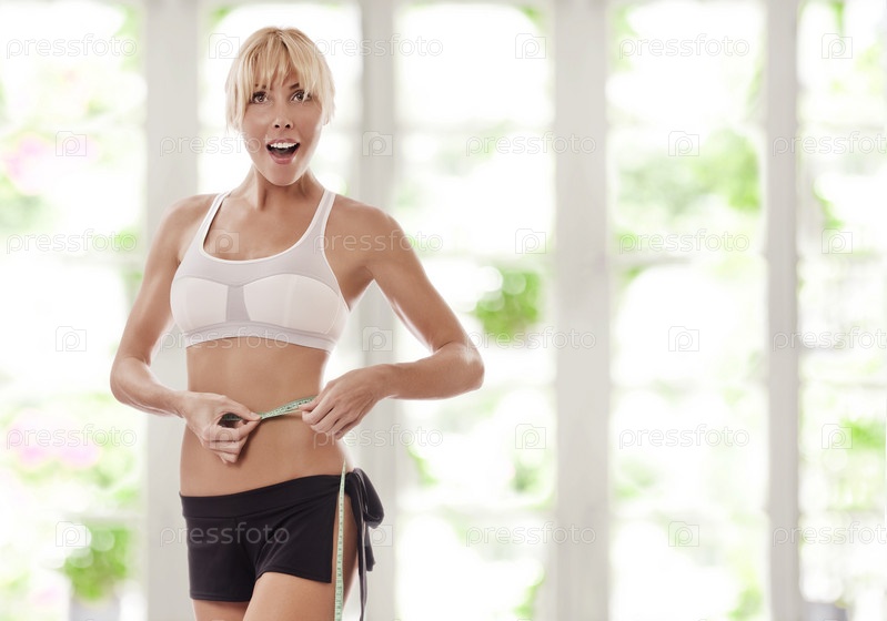 Молодая красивая женщина измеряет талию
