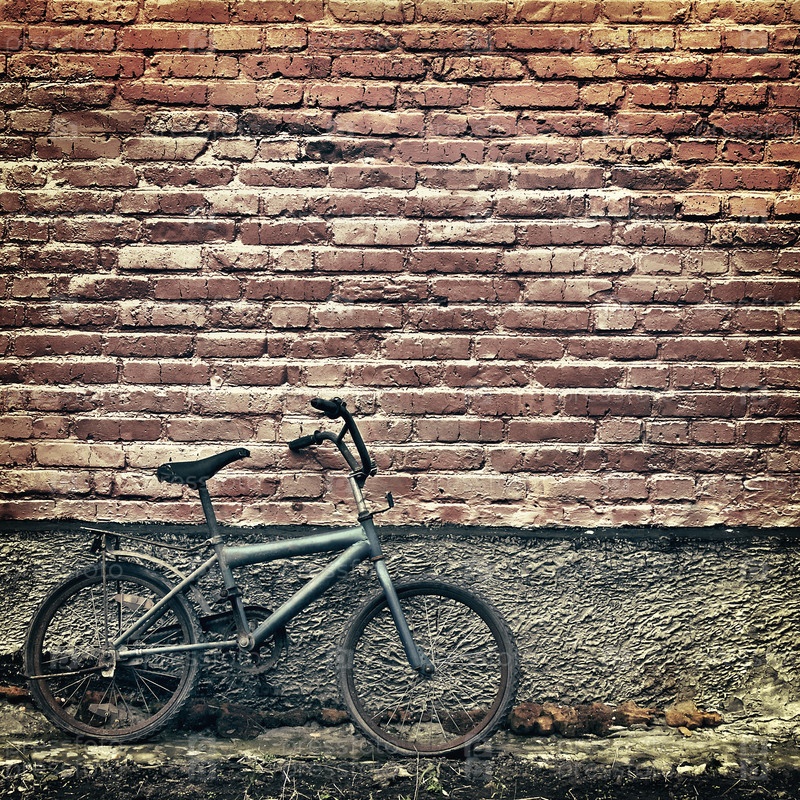 Старый ржавый велосипед у кирпичной стены