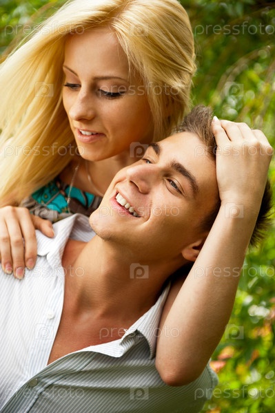 Молодая влюбленная обнимающаяся пара на природе, портрет