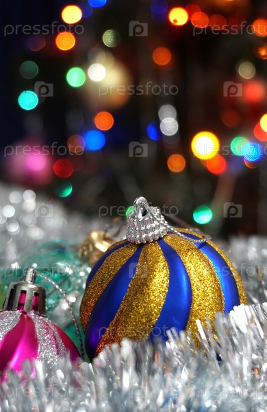 Новогодние шары на фоне разноцветных огней