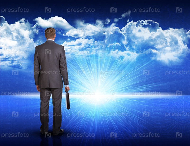Бизнесмен стоит на фоне восходящего солнца