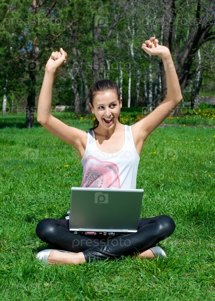 Девушка, сидящая на траве в парке с ноутбуком