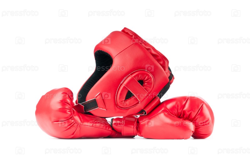 Красный тренировочный шлем и перчатки для бокса на белом фоне
