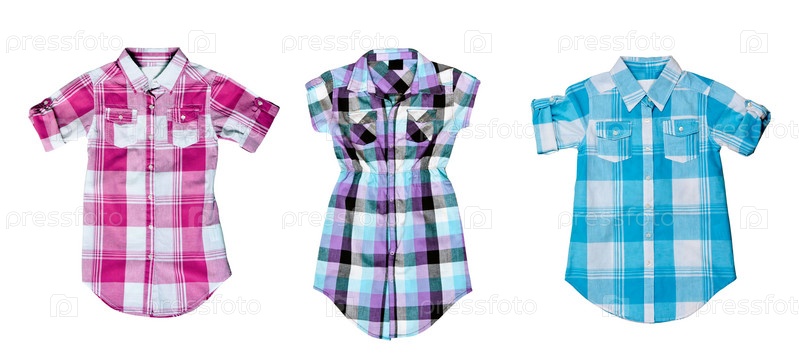 Три клетчатые рубашки разного цвета и фасона на белом фоне