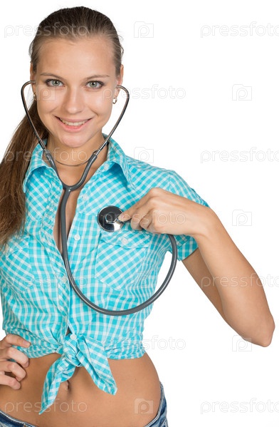 Женщина слушает сердцебиение с помощью стетоскопа
