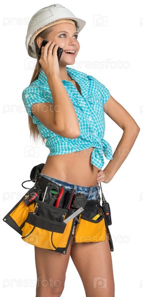 Женщина в каске с инструментами на поясе
