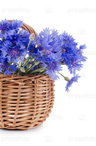 Букет васильков в корзине на белом фоне