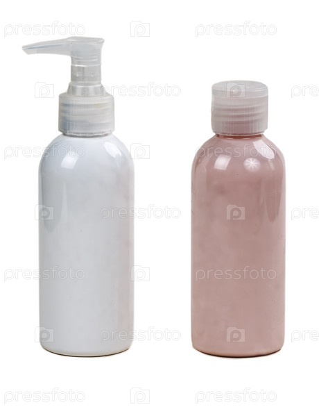 Две бутылки с косметическими средствами на белом фоне