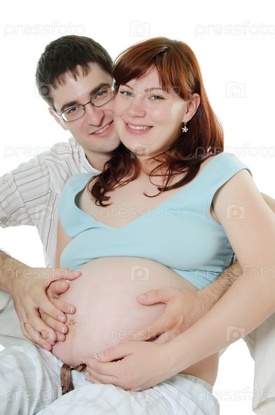 Счастливый муж и беременная жена на белом фоне