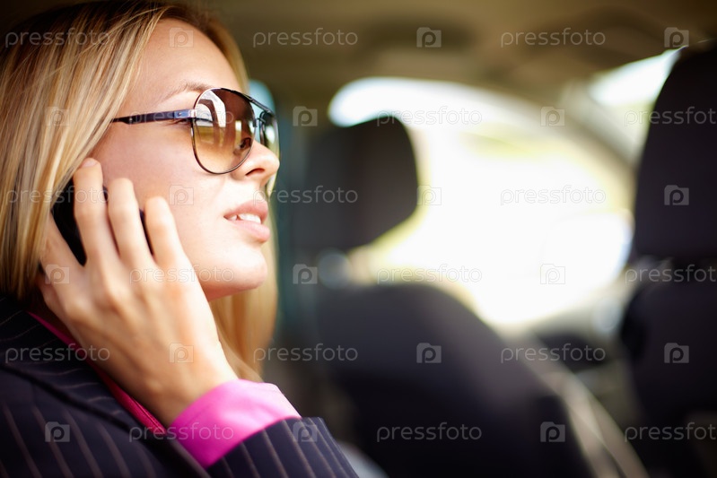 Женщина говорит по мобильному телефону, сидя в автомобиле