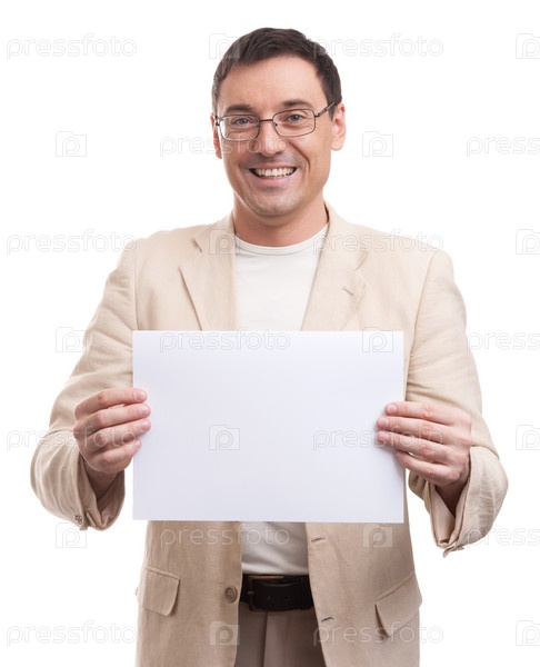 Веселый мужчина с пустым баннером
