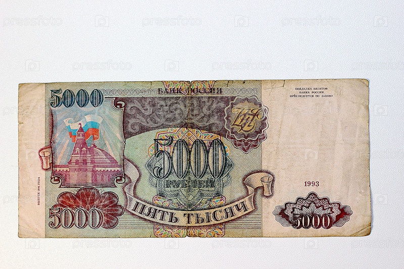 Купюра 5000 рублей 1993 года на белом фоне