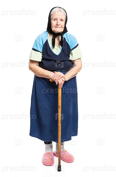 Пожилая женщина с тростью на белом фоне