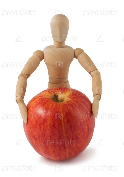Деревянный манекен и красное яблоко на белом