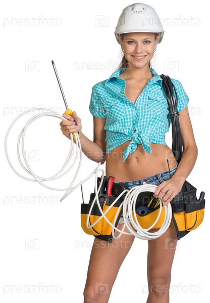 Женщина в каске и инструментами на поясе