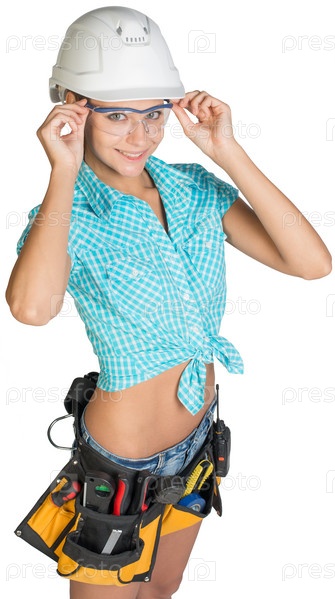 Женщина в каске с инструментами на поясе