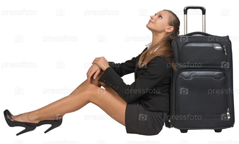 Бизнес-леди с чемоданом на белом фоне