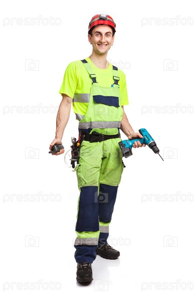 Строитель с шуруповертом и рацией