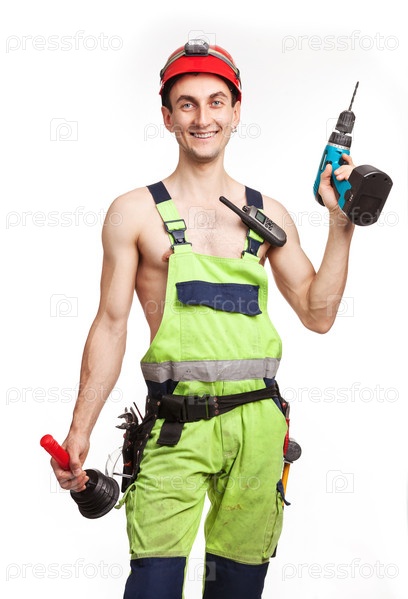 Строитель с шуруповертом и рацией