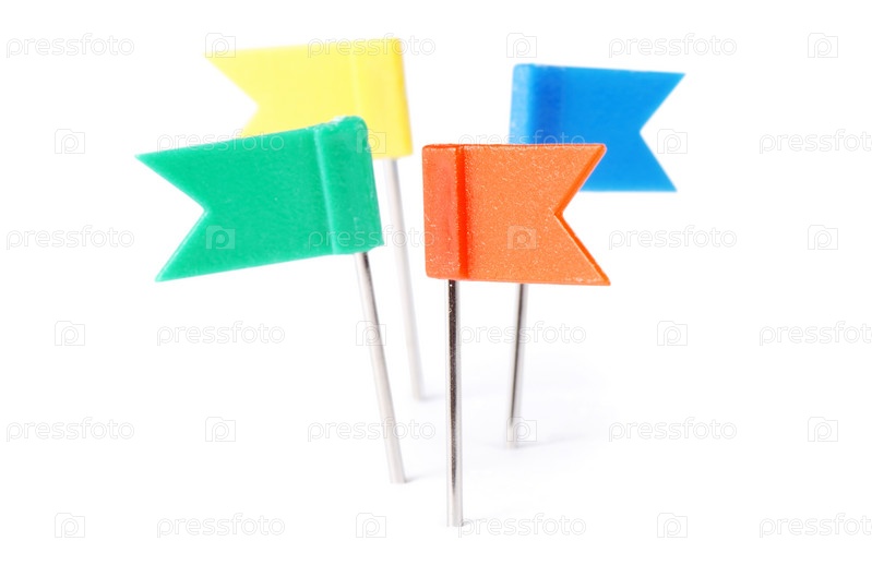 Крупным планом разноцветные канцелярские кнопки на белом