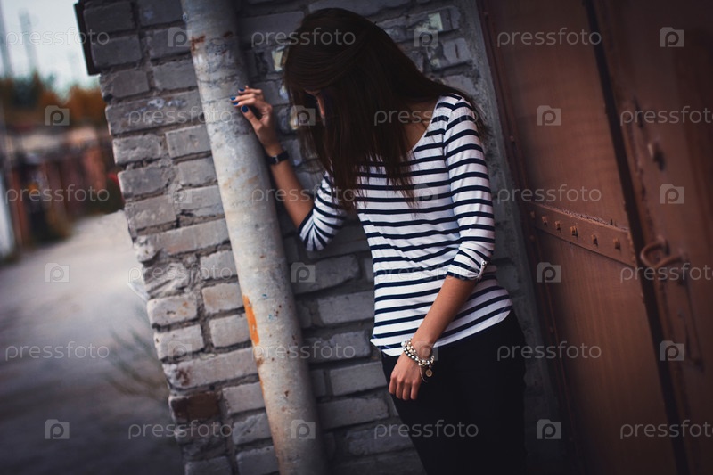 Девушка стоит у кирпичной стены