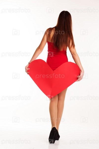 Красивая женщина держит большое красное сердце