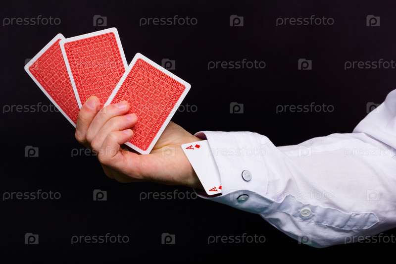 Мужские руки, держащие три карты и туз в рукаве